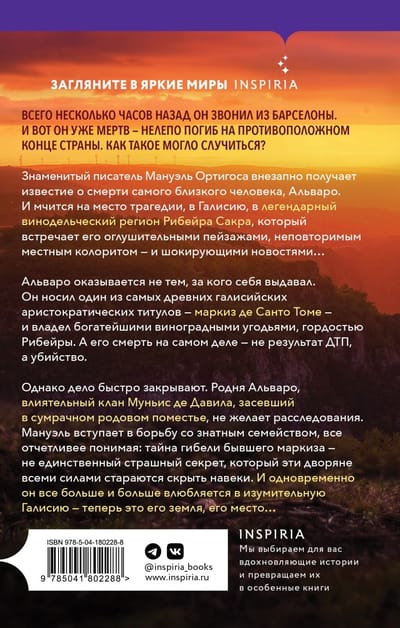 The famous writer Manuel Ortigoza suddenly receives news of the death of the closest person, Alvaro. And rushes to the scene of the tragedy, in Galicia, in the legendary wine region of Ribeira Sacra, which welcomes him with stunning landscapes, unique local color - and shocking news ... Alvaro is not who he said he was. He held one of Galicia's oldest aristocratic titles: Marquis de Santo Tomé - and owned the richest vineyards, the pride of Ribeira. And his death is actually not the result of a traffic accident, but a murder. However, the case is quickly closed. Alvaro's kin, the powerful Muniz de Davila clan, ensconced in the dusky family estate, does not want an investigation. Manuel enters into a struggle with the noble family, increasingly clearly realizing: the mystery of the death of the former marquis - not the only terrible secret, which these nobles are trying with all their might to hide forever. And at the same time he falls more and more in love with the marvelous Galicia - now it is his land, his place...