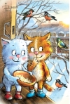 Postcard. Blue cats. Feeding the titmice.