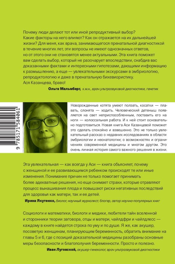 Raising a healthy and happy human being - without losing your career, your well-being and your sanity - is a colossal job, despite medical advances and rising living standards. As a result, many people decide not to have children at all: it's complicated, and there are already almost 8 billion of us on the planet. Science journalist, popularizer of science and young mother Asya Kazantseva would be very surprised if five years ago she was told that she would want a child so early. This book, her fourth, is special: in it the author, as always, professionally and fascinatingly, talks about recent research in the field of embryology, neonatology and in vitro fertilization; about real and mythical risks for mother and fetus; about the possibilities and limitations of modern medicine. But that's not all. It is also a personal story of the most important decision in life and the beginning of a great love.