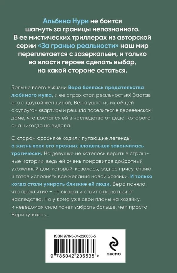 Vera was most afraid of her beloved husband's betrayal in her life, and her fear became reality! Having found him with another woman, Vera left the apartment they shared with her husband and decided to settle in a country house that she inherited from her grandfather, whom she had never seen. There were scary legends about the old mansion, and the lives of all its previous owners had ended tragically. But the girl did not want to believe in scary stories, because she really liked the solid, well-kept house, which seemed happy with her presence and ready to fulfill all the wishes of the new owner. And only when people close to her began to die, Vera realized that the curse was not a fairy tale, and it was worth giving up the inheritance. But the house already has its own plans for its owner, and an unknown force wants to take more than just Vera's life ...