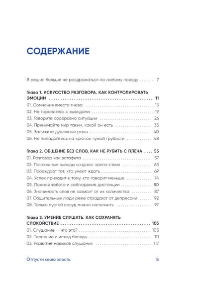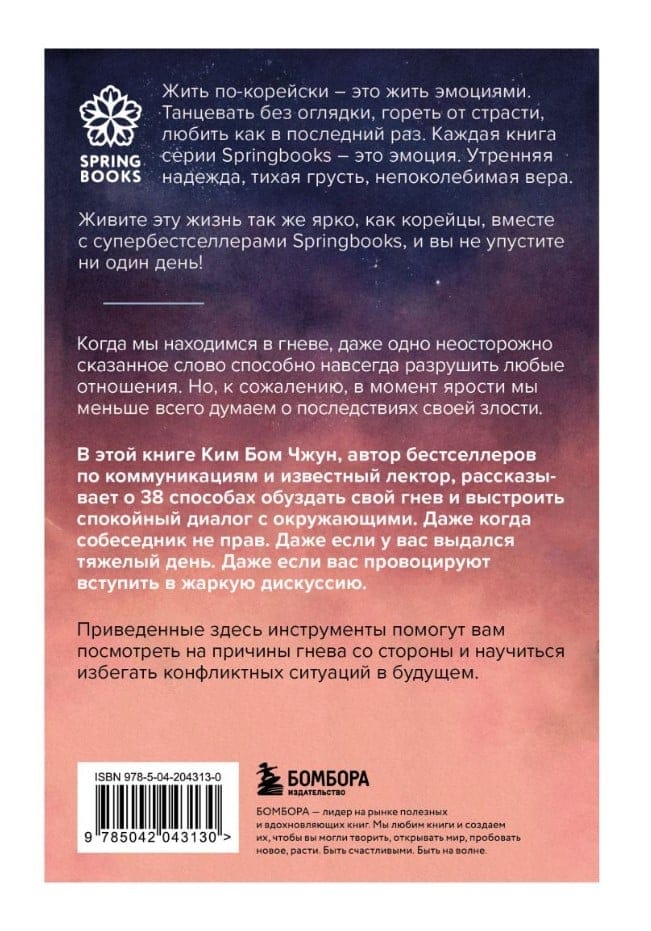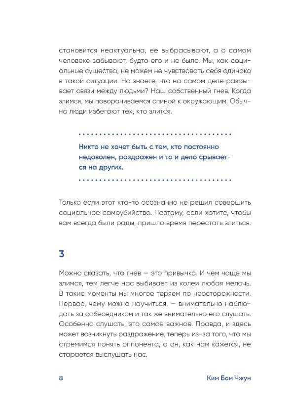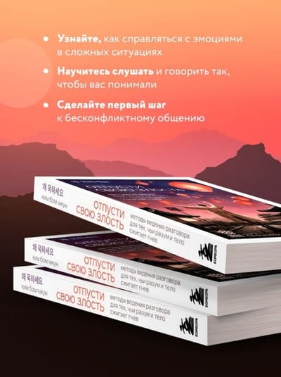 Kim Bum-jun believes that anger plays a key role in the destruction of relationships between people. When we get angry, it is bad not only for us, but also for our interlocutor, as a result of which a conflict arises, and people move away from each other. In life, there are countless situations that can make us lose our temper, but do we react to them correctly? Is it always worth getting angry? Indeed, there are moments that seem to trigger an explosive mechanism inside you. Someone carelessly said a word, and now you are all red with anger, delivering another tirade to the interlocutor. Or in another situation, you listen to an angry speech from the interlocutor. Therefore, the author gives advice for both sides of the conflict. The book has 5 chapters devoted to how to think, speak, listen and even remain silent.