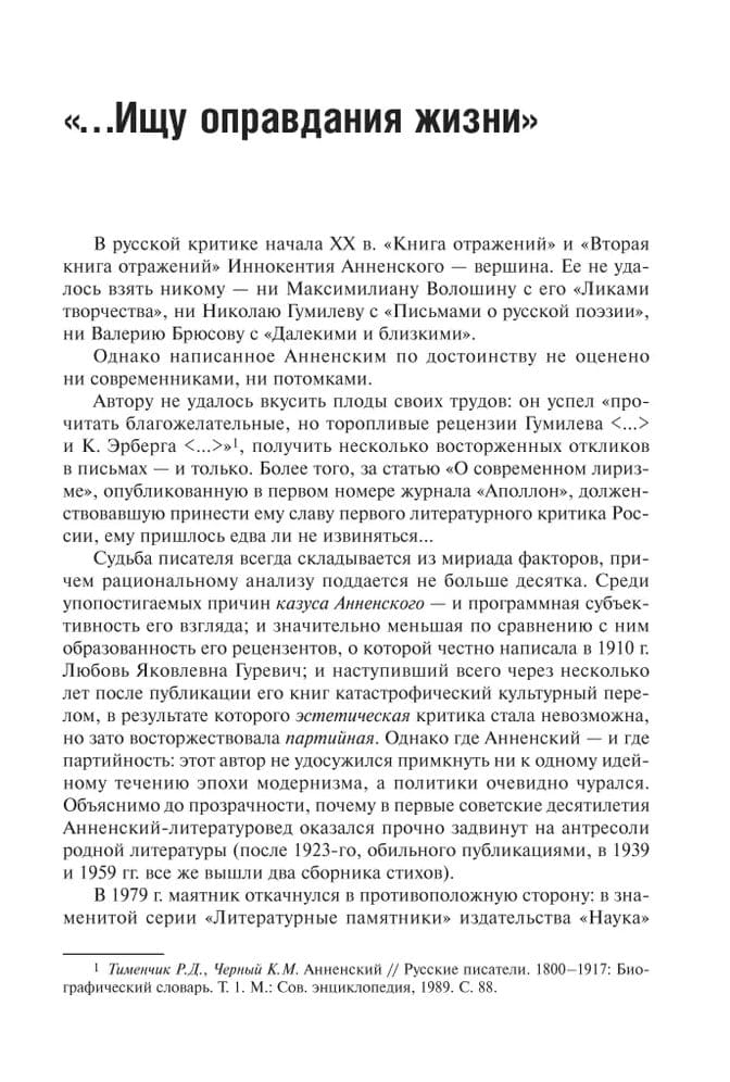 The book by Innokenty Fedorovich Annensky (1855-1909), teacher, expert on Antiquity, poet, translator, playwright, and literary critic, includes his key works: The Book of Reflections (1906), The Second Book of Reflections (1909), and the articles What is Poetry? (written in 1903, published in 1911) and On Modern Lyricism (1909). The selected essays represent the unrivaled pinnacle of Russian aesthetic criticism. Annensky was one of those authors of the Silver Age who sought to establish literary analysis as a form of verbal art. He developed a distinctive style of narrating the works of writers who, in his view, were important for understanding the Russian soul in its striving for beauty as a justification for life, something he tirelessly sought. Annensky's style influenced the later works of N.S. Gumilyov and Yu.I. Tynyanov, V.B. Shklovsky, O.E. Mandelstam, and L.S. Vygotsky. Annensky reconstructs and analyzes what happens in the minds of writers during their creative process. The essay's key findings draw the author closer to the Russian existentialists N.A. Berdyaev and L.I. Shestov. Reflections is intended for those who wish to immerse themselves in the Silver Age, understand its essence, and its connections to previous and subsequent stages of the literary process in Russia. These readers, of course, are primarily students of humanities universities and teachers of secondary and higher education. The commentary, covering a wide range of realities from the mid-19th to early 20th centuries, is intended to help readers navigate the complex linguistic, cultural, and historical processes of the era.