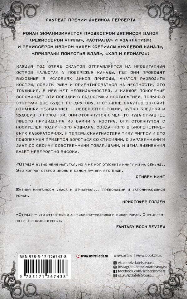 Each year, a Scout troop travels to the uninhabited island of Falstaff off the coast of Canada, where they spend a weekend in the wilderness, learning how to build fires, fish and navigate the terrain. It's a tradition, there are no surprises, and every generation remembers these trips with joy and nostalgia. Only this time everything will be different. A strange stranger walks out to the scouts' parking lot - incredibly skinny, eerily pale, and monstrously hungry. They will encounter something far scarier than any ghost from a campfire tale. They will encounter the bearer of a true nightmare created in the biogenetic laboratories. And now Scoutmaster Tim Riggs and his charges will have to fight the elements, the infected, and even their own comrades, and the price of survival will be incredibly high.