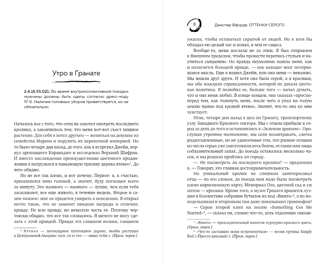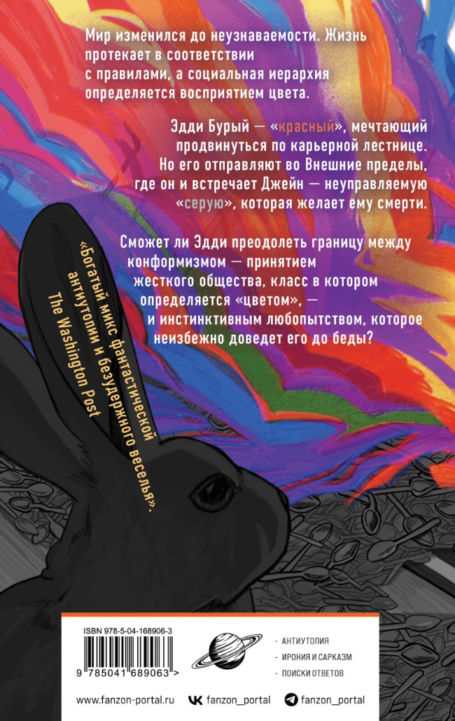 Young Eddie Brown has no aspirations to be anything other than a loyal trudge of the Collective. With his more subtle perception of the color red, he may well marry Constance Maren and inherit her family's plant. He might even have enough red perception to take the position of perfekt. For Eddie, life looks colorful. Life looks good. But everything changes when he moves with his father, a respected color picker, to East Carmine. There he falls in love with a "gray" named Jane, who opens his eyes to the painful truth hidden in a seemingly perfect but tightly controlled society. Curiosity - a dangerous trait not to be shown - takes over Eddie, and he begins to ask questions. Why are there not enough spoons? What happened to those who didn't return from Upper Saffron? And why, when you start to question the world around you, is black and white certainty reduced to shades of gray?