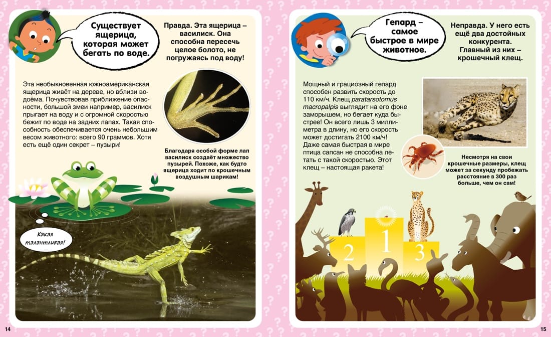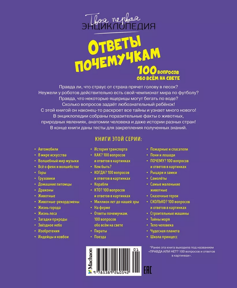 Is it true that an ostrich hides its head in the sand when it's scared? Do robots really have their own World Cup? Is it true that some lizards can run on water? How many questions does an inquisitive child ask! With this book, he will finally reveal all the secrets and learn a lot of new things! The encyclopedia contains amazing facts about animals, natural phenomena, human anatomy, and even the history of different countries! At the end of the book, there are tests to consolidate the knowledge gained.