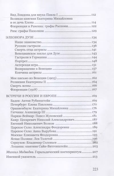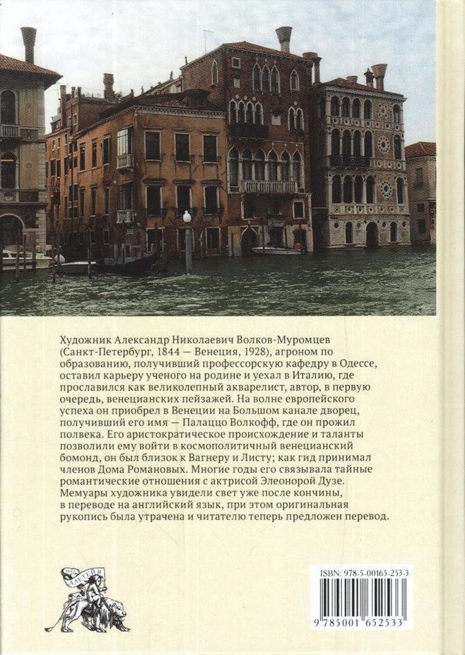 The artist Alexander Nikolayevich Volkov-Muromtsev (St. Petersburg, 1844-Venice, 1928), who was educated as an agronomist and received a professorship in Odessa, left his career as a scientist in his homeland and went to Italy, where he became famous as an excellent watercolorist, the author, first of all, of Venetian landscapes. On the wave of European success, he acquired a palace in Venice on the Grand Canal, which received his name - Palazzo Volkoff, in which he lived for half a century. His aristocratic background and talents allowed him to enter the cosmopolitan Venetian bohomondom, he was close to Wagner and Liszt; as a guide he received members of the House of Romanoff. For many years he had a secret romantic relationship with the actress Eleonora Duse. His memoirs were published after his death, translated into English, the original manuscript having been lost and the reader is now offered a back translation.