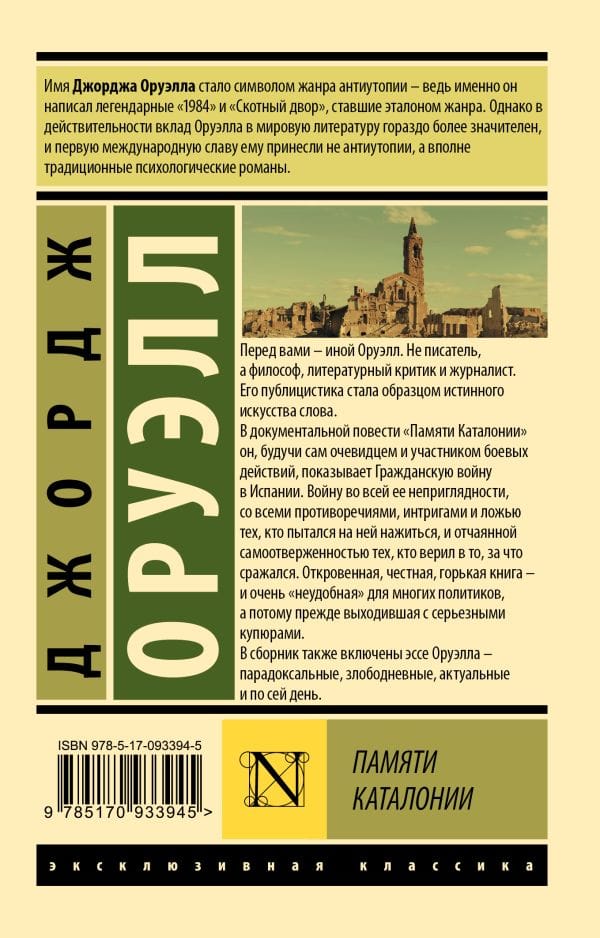 This is a different Orwell. Not a writer, but a philosopher, literary critic and journalist. His journalism has become a model of the true art of words. In the documentary story "In Memory of Catalonia" he, being himself an eyewitness and participant in the fighting, shows the Spanish Civil War. The war in all its unsightliness, with all the contradictions, intrigues and lies of those who tried to profit from it, and the desperate dedication of those who believed in what he fought for. A frank, honest, bitter book - and very "uncomfortable" for many politicians, and therefore previously published with serious cuts. The collection also includes Orwell's essays - paradoxical, topical, and still relevant today.