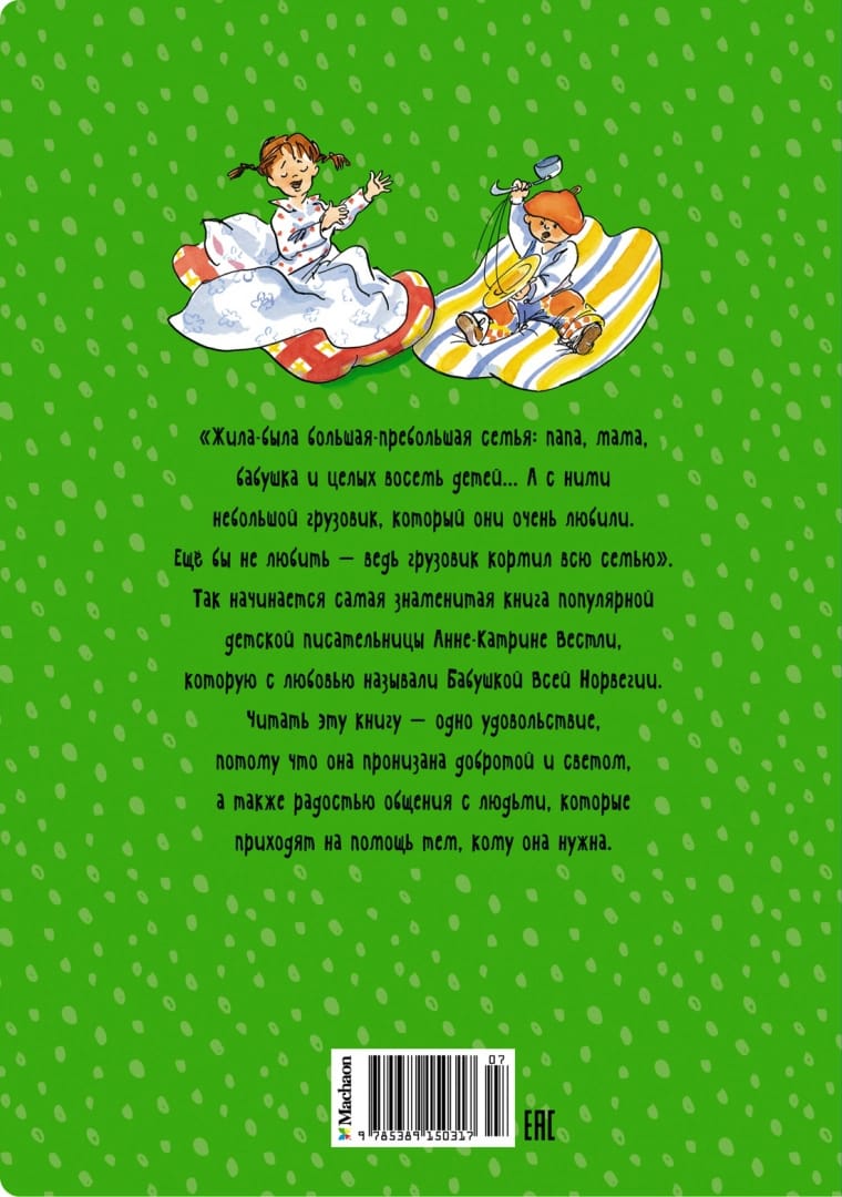 "Once upon a time there was a big, big family: dad, mom, grandma and eight children... And with them a small truck, which they loved very much. They should have loved it, because the truck fed the whole family!" So begins the most famous book by the popular children's author Anne-Katrine Westley, who for her half-century of creativity was awarded the title of Grandmother of All Norway. Reading this book is a pleasure, because it is permeated with kindness and light, as well as the joy of communication with people who come to the aid of those who need it.