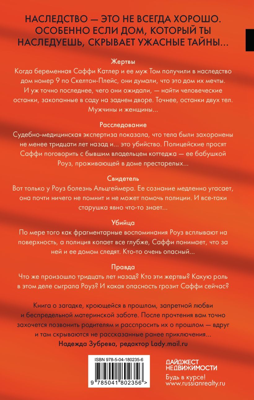 Victims. When pregnant Saffie Cutler and her husband Tom inherited house number 9 Skelton Place, they thought it was their dream home. And certainly the last thing they expected was to find human remains buried in the back garden. Or rather, the remains of two bodies. A man and a woman... Investigation. Forensic examination reveals that the bodies were buried at least thirty years ago and... it's a murder. The police ask Saffy to speak to the former owner of the cottage - her grandmother Rose, who lives in a nursing home... Witness. Except Rose has Alzheimer's. Her consciousness is slowly fading, she remembers almost nothing and can not help the police. And yet the old woman clearly knows something... The killer. As Rose's fragmented memories surface and the police dig deeper, Saffy realizes that she and her home are being watched. Someone very dangerous... Really. So what happened thirty years ago? Who are the victims? What role did Rose play in the case? And what danger does Saffy face now?