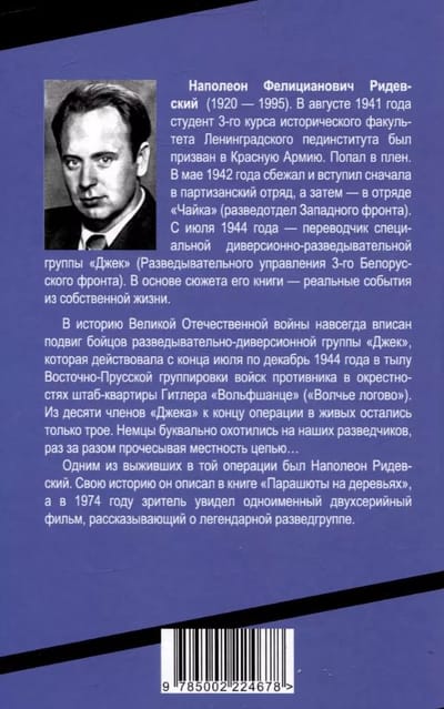 The feat of the fighters of the reconnaissance and sabotage group "Jack", which operated from the end of July to December 1944 in the rear of the East Prussian group of enemy troops in the vicinity of Hitler's headquarters "Wolfschanze" ("Wolf's Lair"), will forever be inscribed in the history of the Great Patriotic War. Of the ten members of "Jack", only three remained alive by the end of the operation. The Germans literally hunted our scouts, combing the area in a chain time after time... One of the survivors of that operation was Napoleon Ridevsky. He described his story in the book "Parachutes on the Trees", and in 1974 the audience saw a two-part film of the same name, telling the story of the legendary reconnaissance group.