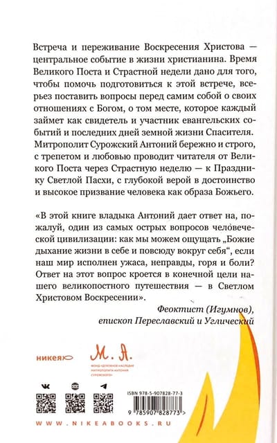 The meeting and experience of the Resurrection of Christ is the central event in the life of a Christian. The time of Great Lent and Holy Week is given to help prepare for this meeting, to seriously ask questions about one's relationship with God, about the place that each one will take as a witness and participant in the Gospel events and the last days of the earthly life of the Savior. In this book, Bishop Anthony of Sourozh takes the reader, carefully and strictly, with trepidation and love, from Great Lent through Holy Week - to the Feast of the Bright Resurrection of Christ, with deep faith in the dignity and high calling of man as the image of God.