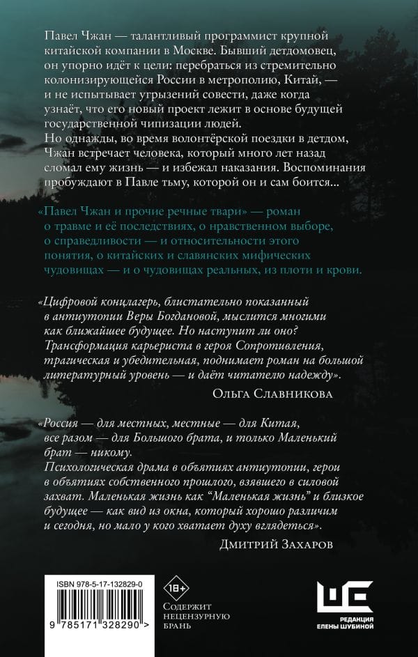 But one day, while volunteering at an orphanage, Zhang meets the man who, years ago, broke his life - and got away with it. The memories awaken a darkness in Paul that he himself fears..... "Pavel Zhang and Other River Creatures" - a novel about trauma and its consequences, about moral choices, about justice - and the relativity of this concept, about Chinese and Slavic mythical monsters - and about monsters real, flesh and blood. "Digital concentration camp, brilliantly shown in Vera Bogdanova's dystopia, is thought by many as the near future. But will it come? The transformation of a careerist into a hero of the Resistance, tragic and convincing, raises the novel to a great literary level - and gives the reader hope." Olga Slavnikova "Russia is for the locals, the locals for China, all at once for Big Brother, and only Little Brother for no one. Psychological drama in the embrace of dystopia, the heroes in the embrace of their own past, taken in the power grip. Little Life as "Little Life" and the near future as a view from the window, which is clearly visible today, but few people have the guts to look into it. Dmitry Zakharov