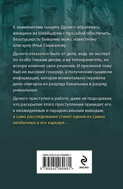 A woman from Switzerland approached the renowned detective Drongo with a request to provide security for her ex-husband, the well-known oligarch Ilya Smykalov. Drongo initially declined the case, as he was an expert in particularly serious cases, not a bodyguard, but soon changed his mind. The reason for this was not the high fee, but the information he had obtained, which instantly elevated the oligarch's case from the mundane to the unique.