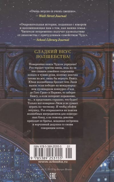 The Chuds' cookbook has been stolen! Roz is tormented by guilt, because of her main family treasure fell into the wrong hands, so the girl is ready to do anything to get the Book back. The young sorceress challenges Aunt Lily: if she wins the international culinary competition "Gala de Gato Grand" in Paris, she will take the Book, and if she is defeated, then ... and it is terrible to imagine what will happen! But the wily Lily has no intention of playing fair. And to get around her aunt, Roz goes in search of magical ingredients for the contest dishes, and to help the girl come her brothers, little sister and grumpy grandfather with his talking cat. Kathryn Littlewood is a writer and actress based in New York City. "Chuds Bakery. A pinch of magic" - a sequel to her debut novel, loved by young readers not only in the author's homeland, but also in different countries around the world.