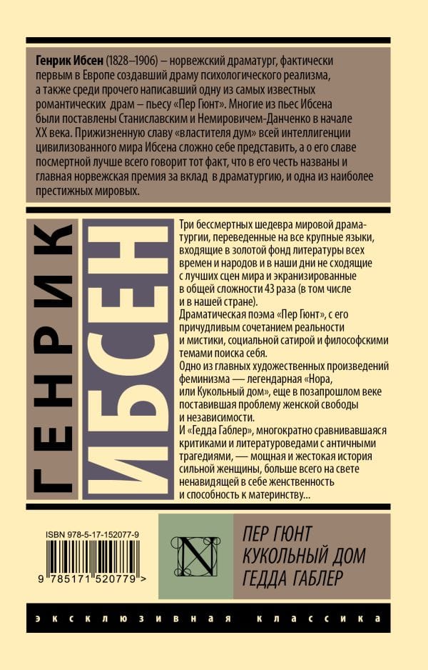 Three timeless masterpieces of world drama, translated into every major language, considered part of the golden trove of literature of all times and peoples, and still featured on the world's finest stages, having been filmed a total of 43 times (including in our country). The dramatic poem "Peer Gynt," with its bizarre blend of reality and mysticism, social satire and philosophical themes of self-discovery. One of the most important works of feminism, the legendary "Nora, or A Doll's House," posed the question of women's freedom and independence back in the 19th century. And "Hedda Gabler," repeatedly compared by critics and literary scholars to ancient tragedies, is the powerful and brutal story of a strong woman who, more than anything else, hates her femininity and capacity for motherhood.