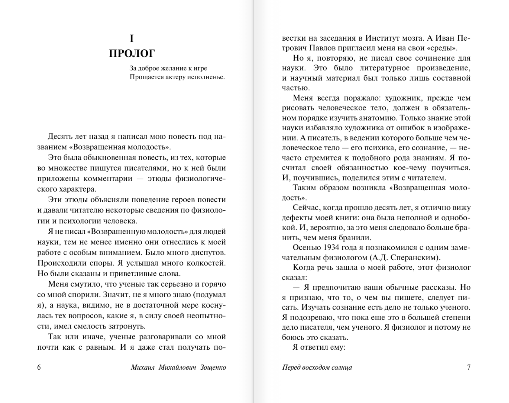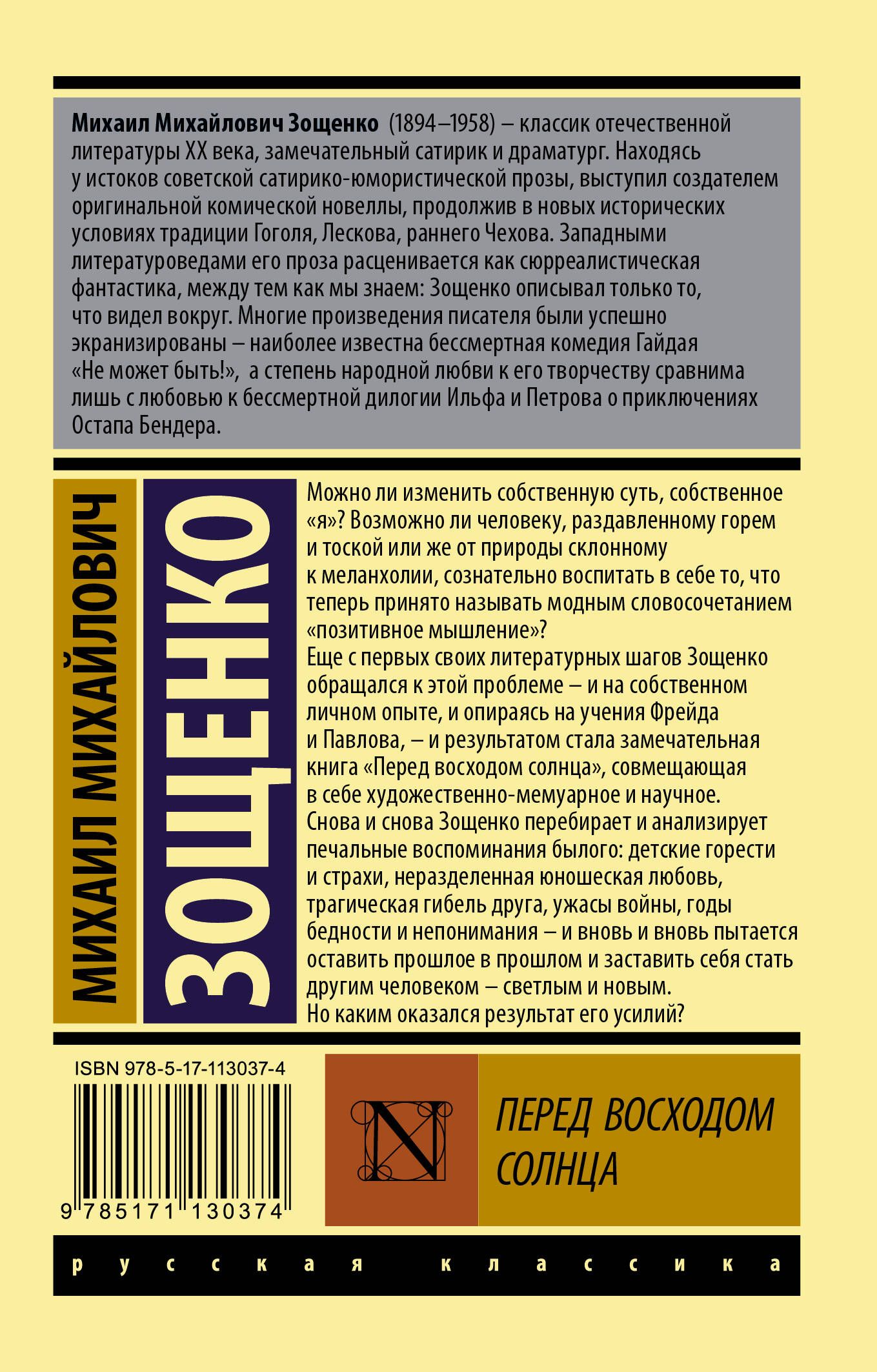 Is it possible to change one's own essence, one's own self? Is it possible for someone crushed by grief and melancholy, or naturally prone to melancholy, to consciously cultivate what is now fashionably called "positive thinking"? From his earliest literary efforts, Zoshchenko addressed this problem—both through his own personal experience and drawing on the teachings of Freud and Pavlov—and the result was the remarkable book "Before Sunrise," a blend of fiction, memoir, and scholarship. Again and again, Zoshchenko revisits and analyzes the sad memories of the past—childhood sorrows and fears, unrequited youthful love, the tragic death of a friend, the horrors of war, years of poverty and misunderstanding—and again and again tries to leave the past in the past and force himself to become a new person—bright and new. But what was the result of his efforts?