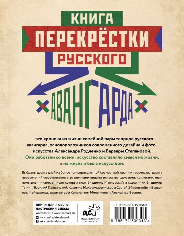 Crossroads of the Avant-Garde is a chronicle book from the life of a married couple of creators of the Russian avant-garde, founders of modern design and photography: Alexander Rodchenko and Varvara Stepanova. They worked with everyone, art was the meaning of their lives, and their lives were art. We have chosen 10 days from more than forty years of their life and work together, 10 intersections with different kinds of art, friends, colleagues, like-minded people, including poet Vladimir Mayakovsky and artists Vladimir Tallin, Wassily Kandinsky, Kazimir Malevich, directors Sergei Eisenstein and Vsevolod Meyerhold, architects Konstantin Melnikov and Alexander Vesnin.