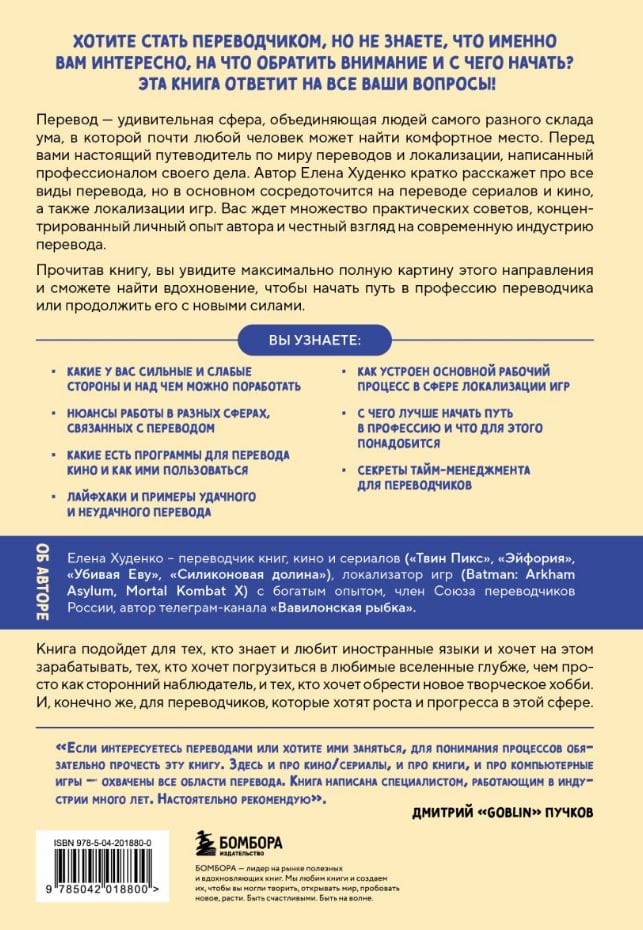 The book is suitable for those who know and love foreign languages and want to earn money from it, those who want to immerse themselves in their favorite universes more deeply than just as an outside observer, and those who want to find a new creative hobby. And, of course, for translators who want growth and progress in this field.