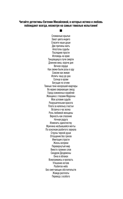 High professionalism and brilliant literary talent Eugenia Mikhailova charm any reader. Her novels are unique, they turn the soul and make the heart beat more often. She is a master of the social detective, her sharp novels reflect the most pressing problems of modern Russian society.