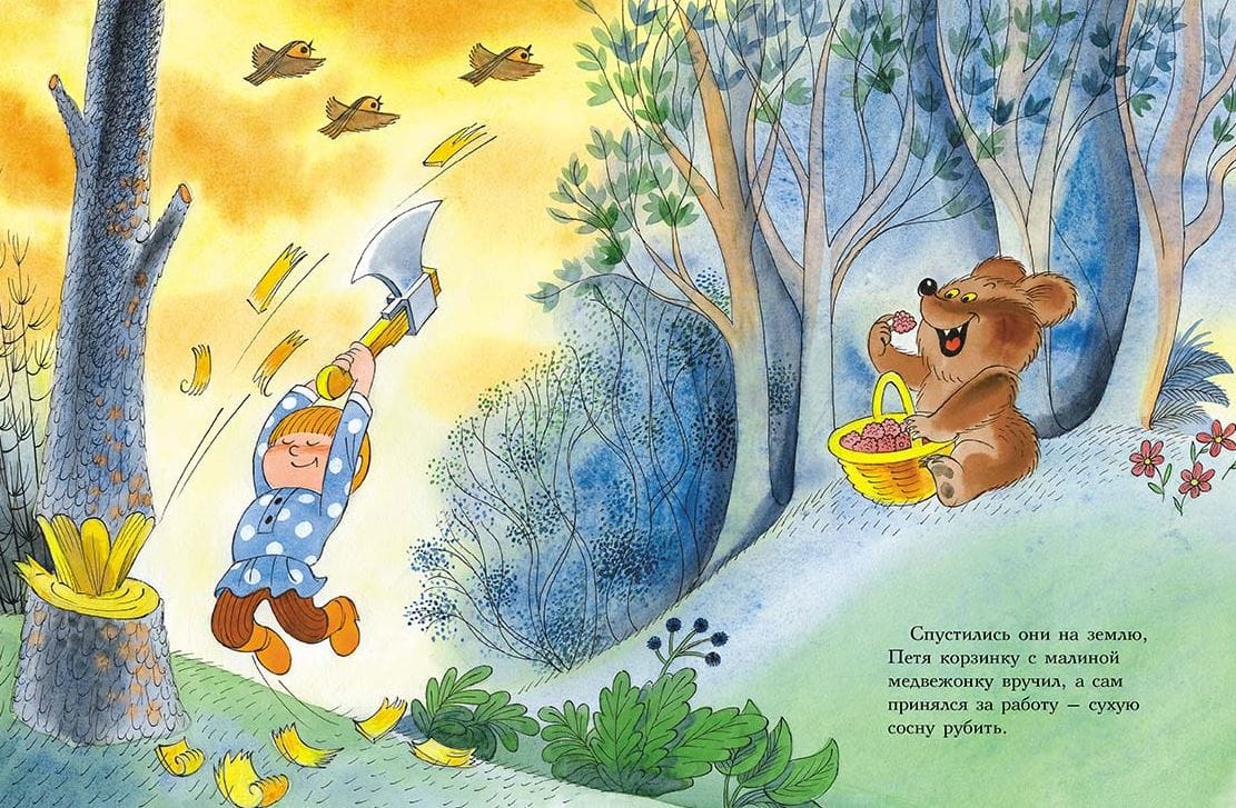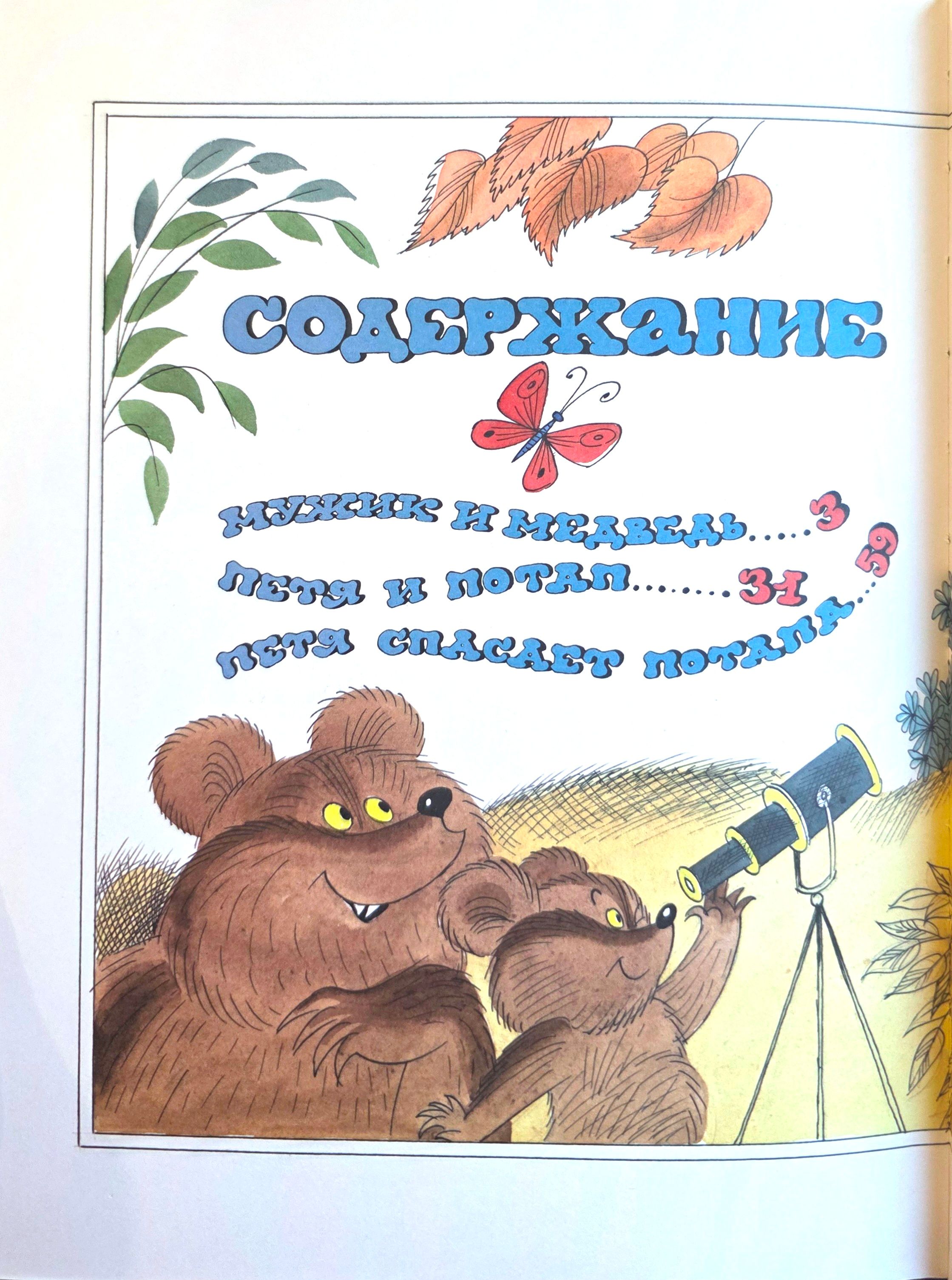 In these tales, the boy Petya and the bear cub Potap became friends and help each other in everything. They pick raspberries together, enjoy them together, and even chop down a dry tree for firewood. And when the Evil Hunter appears, who wants to kill the old bear and the cub and sell their skins, the clever Petya comes up with a way to get rid of him. With the help of his friend Potap and Grandpa Bear, he sends the Evil Hunter - no more, no less - into space, where he still flies in zero gravity, and the astronauts feed him. Even though he is evil, he is still a man.