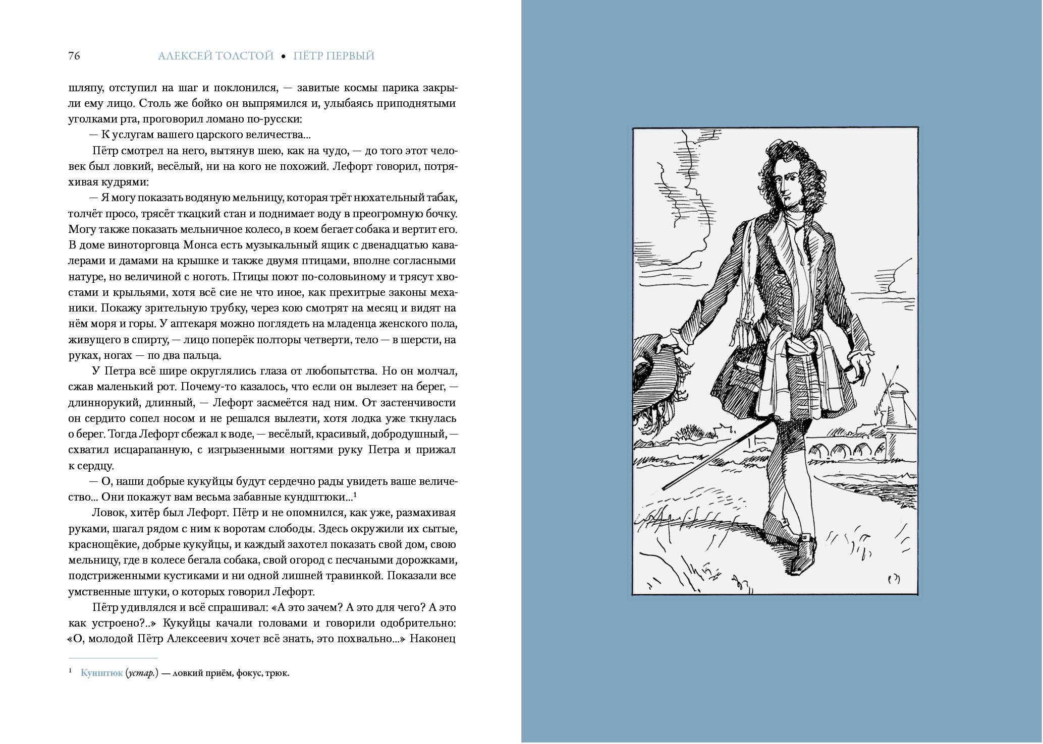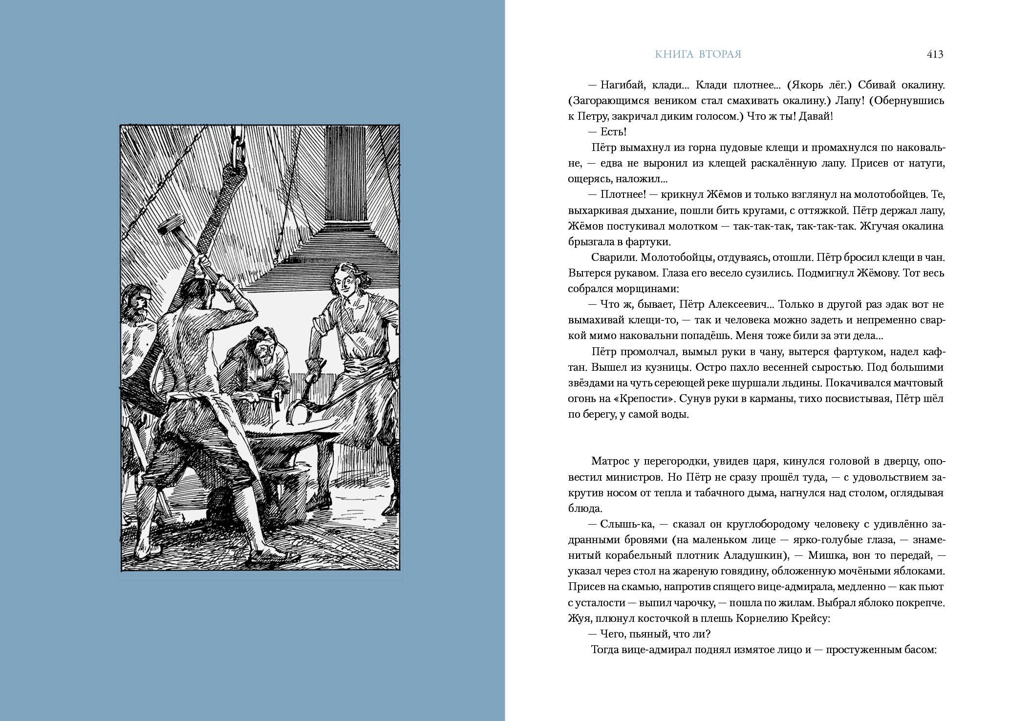 Ah. N. Tolstoy began to write the novel “Peter the First” in 1929. The first decade of the eighteenth century is an amazing picture of an explosion of creativity, energy, enterprise. The old world is cracking and crumbling. Europe, waiting for the wrong thing, looks at the emerging Russia in amazement and fear. In his work, Tolstoy used a variety of sources: the research of historians, notes and letters of Peter’s contemporaries – Russians and foreigners, military reports and decrees of that time, diplomatic correspondence, judicial archives and literary monuments of the era, as well as folklore material, which vividly and organically fits into the artistic fabric of the novel, forming an inseparable whole with it.