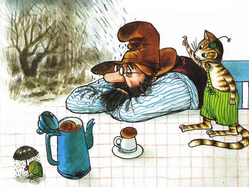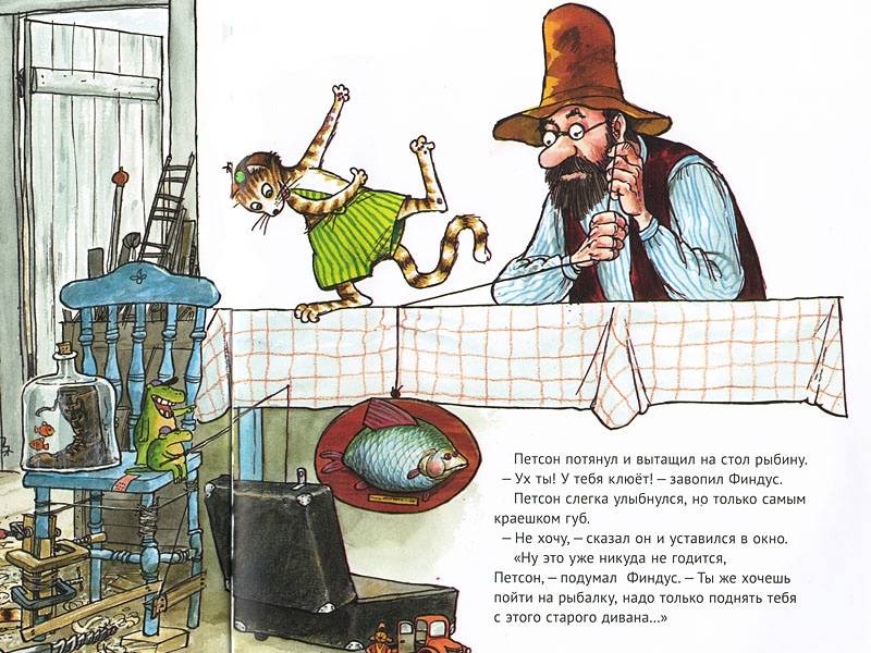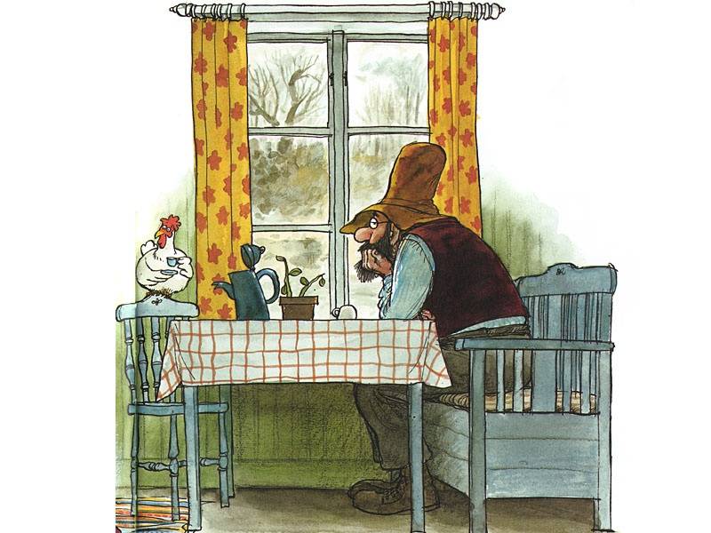 "I'm in a lousy mood today, don't bother me with trivia," Petson said. Findus stared at his host in surprise. He had never seen him so angry before. "We'll have to think of something to cheer up Petson," thought the kitten.