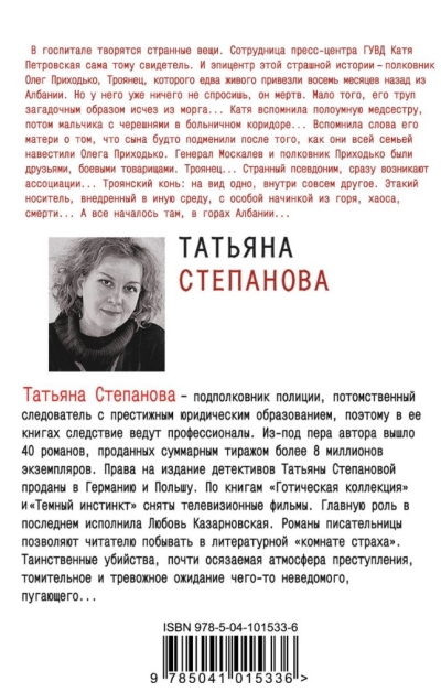 Strange things are happening at the hospital. Katya Petrovskaya, an employee of the press center of the Main Department of Internal Affairs, is a witness to this herself. And the epicenter of this terrible story Colonel Oleg Prikhodko - Trojan, who was barely alive brought eight months ago from Albania. But you can't ask him anything, he's dead. Not only that, his corpse mysteriously disappeared from the morgue ... Katya remembered the mad nurse, then the boy with the cherries in the hospital corridor.... She remembered his mother's words that her son had been replaced after the family had visited Oleg Prikhodko. General Moskalev and Colonel Prikhodko were friends, battle buddies. Trojan... Strange pseudonym, immediately arise associations ... A Trojan horse: one thing on the surface, but inside it's something else. A kind of carrier, embedded in a different environment, with a special stuffing of grief, chaos, death ... And it all started there, in the mountains of Albania...