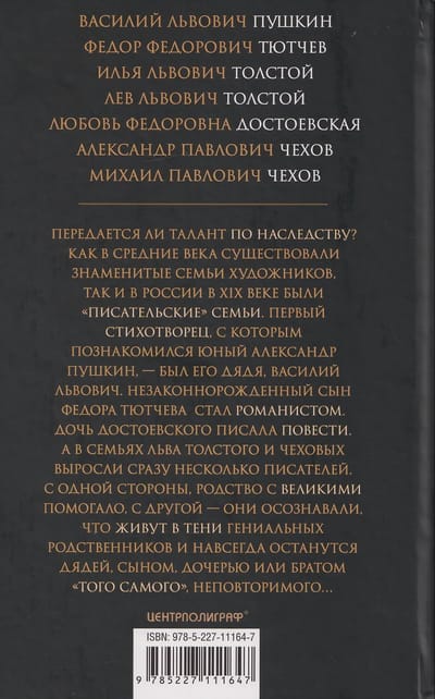 It's unclear whether the talent of a poet or writer is hereditary, but just as in the Middle Ages there were famous families of artists or composers, where a son would inherit his father's craft, so too in Russia in the 19th century there were several "writer" families. The first poet the young Alexander Sergeyevich Pushkin met was his uncle, Vasily Lvovich. The illegitimate son of Fyodor Ivanovich Tyutchev and his mistress, Elena Alexandrovna Denisyeva, he became a novelist. Dostoevsky's daughter, Lyubov, wrote short stories. And the families of Leo Tolstoy and the Chekhovs produced several writers. On the one hand, being related to the greats helped: they knew and saw how literary works are created and the considerable labor involved. On the other hand, they couldn't help but realize they lived in the shadow of their brilliant relatives, that they would forever remain the uncle, son, daughter, or brother of "the one," the inimitable one... Nevertheless, their stories and books are interesting and worthy of being told. The works of the authors discussed in this book are living documents of an era, untouched by the official gloss and untouched by the charade. They were written by ordinary people, just like us. And if these stories have piqued your interest, it means Russian literature is not limited to the names we find in school textbooks.