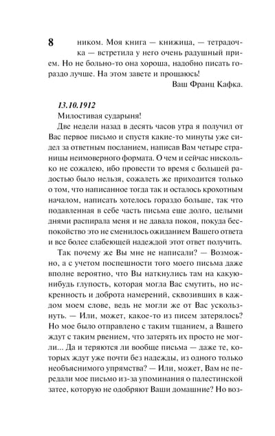 This is a collection of letters from Franz Kafka to his fiancée Felicia Bauer, whose relationship with him was far from simple and never became family. Each of these letters is a document of extreme psychological nakedness of the addressees. The reader will get acquainted with a completely different Franz Kafka: a vulnerable, insecure young man, tormented by all-consuming feelings, experiencing and analyzing them.