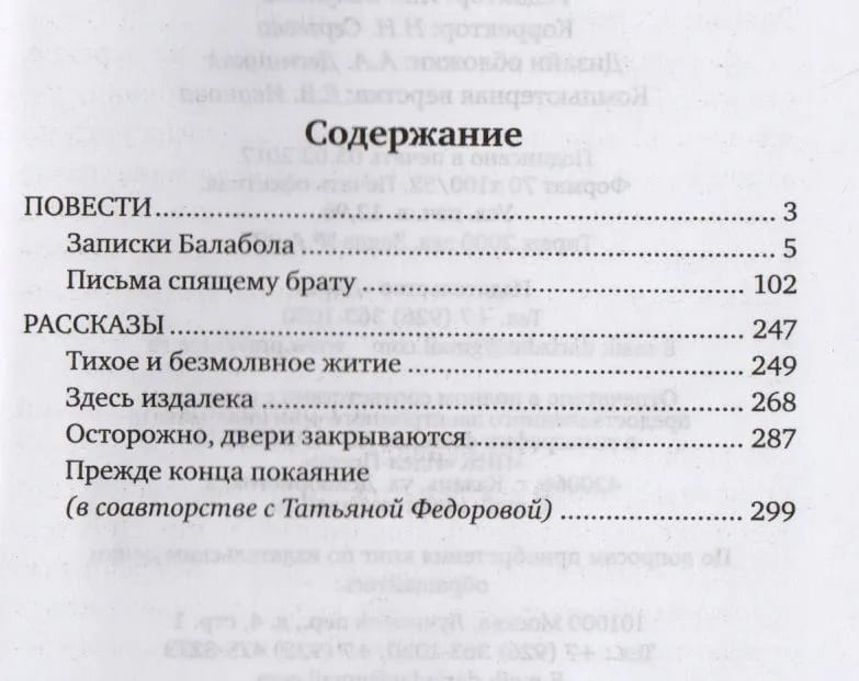 The collection “Letters to a Sleeping Brother” includes two stories and four short stories (one written in collaboration with T. Fedorova). The story “Notes of Balabol” continues the famous “Letters of Balamut” by K.S.