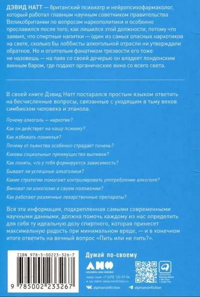 In his book, Nutt tried to answer in simple terms the countless questions surrounding the symbiosis of humans and ethanol, which has been going on for centuries. Why is alcohol a drug? How does it affect our psyche? How can we avoid a hangover? Why does the liver suffer especially from drinking? What are the social benefits of drinking? How can we tell if we are developing an addiction? Are there any successful alcoholics? What strategies help us control our drinking? Is an alcoholic to blame for his or her situation? How do the various medications for treating alcohol addiction work? What should governments do about it?