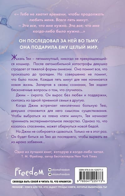 He followed her into the darkness. She gave him the whole world. Thea's life is a five-minute, never ending nightmare. After a car accident, the girl suffers from a severe form of amnesia. She remembers everything that happened before the tragedy. But has absolutely no memory of what happened afterward. Every five minutes a new life begins for her. Locked in her mind, Thea asks endless questions about what happened. Jim is an orphan. He grew up without love or support, wandering from one foster home to another. When Jim meets the terminally ill Thea, the girl becomes the meaning of existence for him. To escape from the captivity of "five minutes", Thea begins to take an experimental drug. However, what seemed to be salvation, may turn out to be a new disaster. But Jim is not going to give up. Not this time. He will fight for Thea to the last to pull her out of the darkness of oblivion...