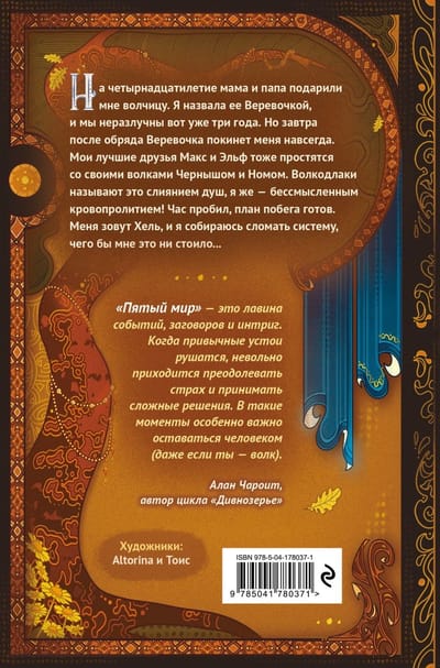 About humans and wolf-dragons who, without knowing it, crossed the road to the gods ... On her fourteenth birthday mom and dad gave Hel a she-wolf, which the girl called Rope. They have been inseparable for three years now. But tomorrow, after a brutal rite of passage, Rope will leave Hel forever. Her best friends Max and Elf will also say goodbye to their wolves Blacky and Nom. Wolfhounds call it a fusion of souls, and Hel calls it a senseless bloodbath! The hour has struck, the escape plan is ready. Hel will break the system no matter what it costs her, even if she is destined to go to the Dead God's realm to do so... "'The Fifth World' is an avalanche of events, conspiracies, and intrigue. When the usual foundations collapse, involuntarily have to overcome fear and make difficult decisions. At such times it is especially important to remain human (even if you are a wolf)." - Alan Charoit, author of the Divnozerie series For fans of Leah Arden's Mara and Morok, Ulyana Cherkasova's Golden Lands series, and Elena Kondratska's books. Gold foil on the cover, forzats and colored inserts with characters! Such a bright decoration of the book was given by popular artists Altorina and Tois. The creative duo has already won many hearts, their style is recognizable and loved by Russian readers.