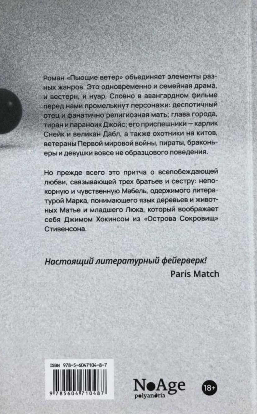The novel "The Wind Drinkers" combines elements of several genres. It is simultaneously a family drama, a Western, and a film noir. As if in an avant-garde film, we glimpse characters: a despotic father and a fanatically religious mother; the tyrant and paranoid mayor Joyce; his minions, the dwarf Snake and the giant Double; whale hunters, World War I veterans, pirates, poachers, and less-than-model young women. But above all, it is a parable of the all-conquering love that binds three brothers and a sister: the rebellious and sensual Mabel; the literary-obsessed Mark; Mathieu, who understands the language of trees and animals; and the youngest, Luke, who imagines himself to be Jim Hawkins from Stevenson's "Treasure Island."