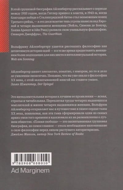 The period from 1933 to 1943 marked the darkest chapter in European history. Facing catastrophe, four philosophers—Hannah Arendt, Simone de Beauvoir, Simone Weil, and Ayn Rand—developed their visionary ideas—on the relationship between the individual and society, between man and woman, between freedom and totalitarianism, between God and humanity—that would sweep the globe and change the world in the second half of the century. German historian of ideas and philosopher Wolfram Eilenberger follows the journey of his heroines, from Leningrad to New York and from Spain at the height of the civil war to Nazi-occupied France, to trace the twisting trajectories of their destinies. They confront the injustice, unfreedom, and incomprehensible violence of their time as women, refugees, members of the Resistance, but above all, as thinkers. As we follow the smelting of their radical ideas in the merciless crucible of time, we, along with the heroines, become convinced of the redemptive power of thought.