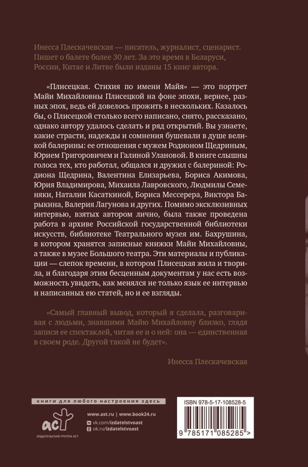 "Plisetskaya. Element named Maya" - a portrait of Maya Mikhailovna Plisetskaya on the background of the era, or rather, different eras, because she happened to live in several. It would seem that so much has been written, filmed and told about Plisetskaya, but the author managed to make a number of discoveries. You will learn what passions, hopes and doubts raged in the soul of the great ballerina: her relationship with her husband Rodion Shchedrin, Yuri Grigorovich and Galina Ulanova. In the book you can hear the voices of those who worked, socialized and were friends with the ballerina: Rodion Shchedrin, Valentin Elizariev, Boris Akimov, Yuri Vladimirov, Mikhail Lavrovsky, Lyudmila Semenyaka, Natalia Kasatkina, Boris Messerer, Viktor Barykin, Valery Lagunov and others. In addition to exclusive interviews taken by the author personally, work was also done in the archive of the Russian State Library of Arts, the library of the Bakhrushin Theater Museum. Bakhrushin, where Maya Mikhailovna's notebooks are kept, as well as in the Bolshoi Theater Museum. These materials and publications are a cast of the times in which Plisetskaya lived and created, and thanks to these invaluable documents we have the opportunity to see how not only the language of her interviews and articles, but also her views changed.