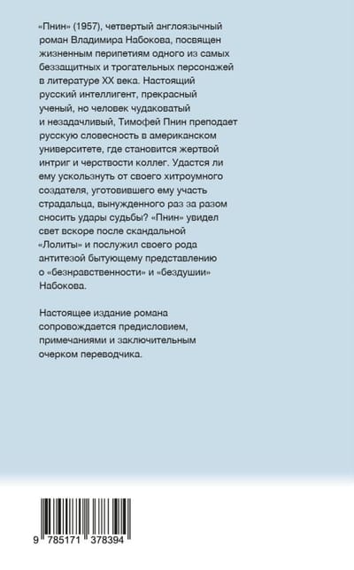 "Pnin" (1957), the fourth English-language novel by Vladimir Nabokov, is devoted to the life vicissitudes of one of the most defenseless and touching characters in the literature of the XX century. Timofey Pnin, a true Russian intellectual, a fine scholar, but a man of odd and hapless character, who left Russia after the 1917 revolution, teaches Russian literature at an American university, where he becomes an accidental victim of intrigue and callousness of his colleagues. Will he this time manage to elude his cunning creator, who prepared him the fate of the sufferer, forced time after time to bear the blows of fate? "Pnin" saw the light soon after the scandalous "Lolita" and, having received rave reviews from readers and critics, served as a kind of antithesis to the popular perception of "immorality" and "callousness" Nabokov. This edition of the novel is accompanied by a preface, notes and a final essay by the translator. The orthography, punctuation and transliteration of the translator have been preserved.