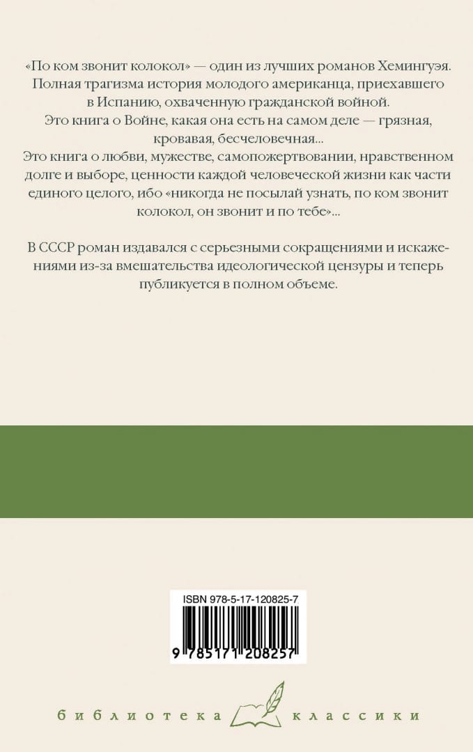 "For Whom the Bell Tolls" - one of Hemingway's best novels. Full of tragedy is the story of a young American who comes to Spain, engulfed in civil war. This is a book about the War as it really is - dirty, bloody, inhumane ... This is a book about love, courage, self-sacrifice, moral duty and choice, the value of each human life as part of the whole, for "never send to find out who rings the bell, it rings and you" ... In the USSR, the novel was published with serious cuts and distortions due to the interference of ideological censorship and is now published in full.