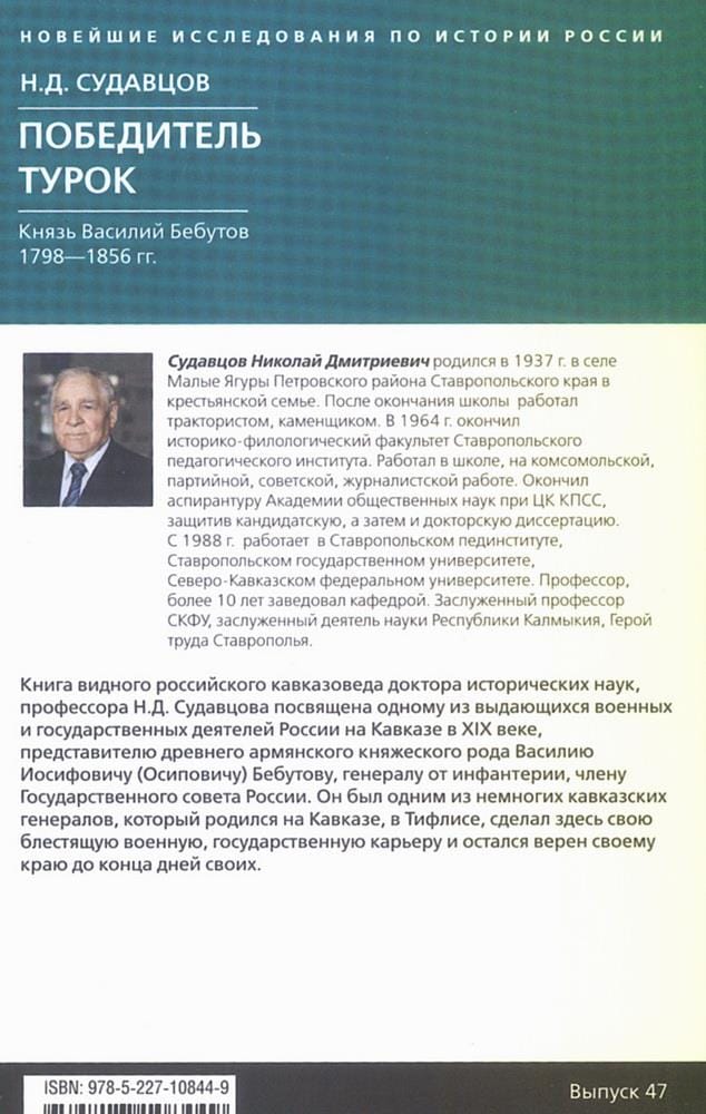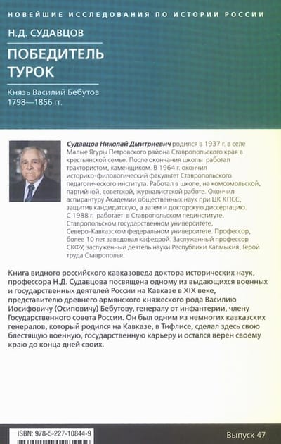 The book of the prominent Russian Caucasian scholar Doctor of Historical Sciences, Professor N.D. Sudavtsov is dedicated to one of the outstanding military and state figures of Russia in the Caucasus in the nineteenth century, a representative of the ancient Armenian princely family Vasily Iosifovich (Osipovich) Bebutov, a general from infantry, a member of the State Council of Russia. He was one of the few Caucasian generals who was born in the Caucasus, in Tiflis, made his brilliant military and state career here and remained faithful to his land until the end of his days.
