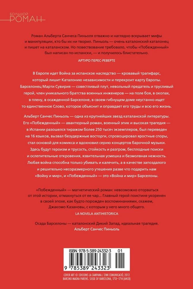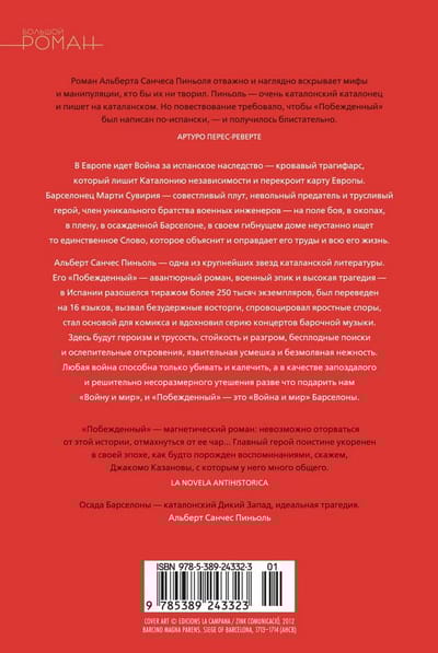 Albert Sanchez Pignol is one of the greatest stars of Catalan literature; he is not inferior to Jaume Cabre in originality and popularity. His “Defeated”, an adventurous novel, a military epic and a high tragedy, in part refers to Grimmelshausen’s “Simplicissimus” and the “Adventures of the Brave Soldier Schweik” by Jaroslav Hasek, Joseph Conrad’s “Duels” and George MacDonald Fraser’s “Notes of the Flashman”, with which the author was particularly inspired. In Spain, the novel sold more than 250,000 copies, was translated into 16 languages, caused unbridled enthusiasm, provoked fierce controversy, received the newspaper El Periódico award for the best novel of 2012, became the basis for the comic book and in addition inspired a series of concerts of Baroque music (this is rare with modern novels). In "Defeated" will be heroism and cowardice, perseverance and defeat, fruitless searches and dazzling revelations, a sarcastic grin and silent tenderness. Any war can only kill and maim, and as a belated and decidedly disproportionate consolation, it can only give us “War and Peace”, and “Defeated” is “War and Peace” of Barcelona.