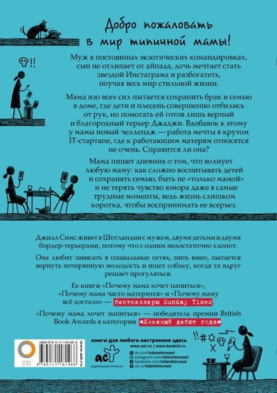 Her husband is on constant exotic business trips, her son can't keep his hands off his iPad, her daughter dreams of becoming an Instagram star and getting rich by teaching the whole world how to live a stylish life. Mom is trying hard to keep the marriage and family in the house, where the children and mold is completely out of hand, but to help her is ready to help only faithful and noble terrier Jaji. On top of that, mom has a new challenge - a dream job at a cool IT startup, where working mothers are not treated very well. Will she be up to it? Mom writes a diary about what worries any mom: how difficult it is to raise children and keep the family, not to be "only a mom" and not lose her sense of humor even in the most difficult moments, because life is too short to take it seriously. Jill Sims lives in Scotland with her husband, two children and two Border Terriers because one isn't enough of a hassle. She enjoys hanging out on social media, drinking wine, trying to regain her lost youth and looking for her dog when she suddenly decides to go for a walk. Her books "Why Mommy Wants to Get Drunk," "Why Mommy Often Swears," and "Why Mommy's Tired of Everything" are Sunday Times bestsellers. "Why Mommy Wants to Get Drunk" is the winner of the British Book Awards in the Book Debut of the Year category.