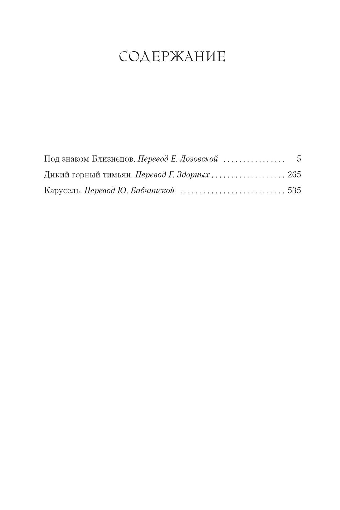 The books of Rosamunda Pilcher (1924-2019) are known and loved all over the world. Her novels are unpretentious and unhurried, but there is a lot of genuine warmth and cordiality in them. The writer's credo can be characterized by the phrase: "Good people will always do well" - and in this case it is one of the pillars of sustainable reader success. This collection presents three novels: "Under the Sign of the Twins", "Wild Mountain Thyme", "Carousel". The heroines of the first of them, separated in childhood twin sisters, never heard of each other, and here fate brings them together. Why not take advantage of their remarkable resemblance? Victoria and Oliver, the heroes of the second book, meet after a long separation and go to an ancient Scottish estate, pretending to be husband and wife ... And in the last novel, the action takes place on the Cornish coast. Smart and independent Prudence comes here from boring London, not suspecting that soon life will swirl her, as if on a magic carousel ...