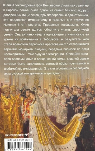 Julia Alexandrovna von Dehn, faithful to Lili, as she was known in the royal family, was one of Alexandra Feodorovna's closest friends and confidantes, her lady-in-waiting, and the only one who supported the empress during the difficult days of Nicholas II's abdication. Loyal to the empress, Julia considered it her duty to ease the plight of the deposed family. She actively began establishing contact with them during their stay in Tobolsk, which enabled correspondence between the arrested and those remaining loyal to the monarchs, as well as the delivery of parcels containing essentials. Already in exile, Julia Dehn wrote memoirs of the royal family, the primary purpose of which was to capture the radiant image of the empress she revered and loved. This book is an eyewitness account of the final act of Russia's monarchical tragedy.