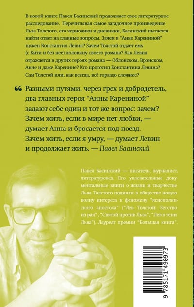 In his new book "The True Story of Konstantin Levin", Pavel Basinsky continues his literary investigation. Re-reading the most mysterious work of Leo Tolstoy, his drafts and diaries, Basinsky tries to find an answer to the main questions. Why does "Anna Karenina" need Konstantin Levin? Why does Tolstoy give him (with or without Kiti) half of his novel? How is Levin reflected in the other characters of the novel - Oblonsky, Vronsky, Anna, and even Karenina? Who is Konstantin Levin's prototype? Tolstoy himself or, as always, is it much more complicated? The book is illustrated with photographs from the archives of the Leo Tolstoy State Museum and the Yasnaya Polyana Estate Museum.