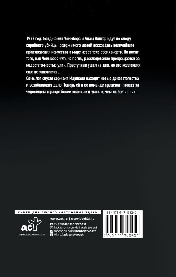 1989. Benjamin Chambers and Adam Winter are on the trail of a serial killer obsessed with recreating the world's greatest works of art through the bodies of his victims. But after Chambers is nearly killed, the investigation is halted for lack of evidence. The perpetrator has gone underground, but his collection is not yet complete.... Seven years later, Sergeant Marshall finds new evidence and reopens the case. Now she and her team must chase a monster far more dangerous and intelligent than any of them.