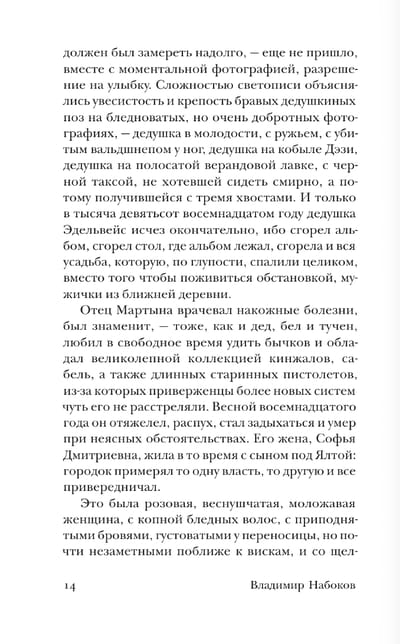 "The Feat" (1931), Vladimir Nabokov's fourth novel, written in Berlin, is a new take on the classic "novel of educa-tion." Nabokov endows his touching hero with some of his own characteristics and circumstances, while at the same time making him a man far removed from literature. A Cambridge graduate with the flowery name of Martyn Edelweiss, a Russian émigré, dreams of doing something exceptional. He travels around Europe and vainly seeks to apply his abilities. The vague desire that has never left him gradually takes shape, and he decides to undertake a feat similar to the mythical descent into Hades - to cross the boundary of the possible and return to his own Russian childhood.
