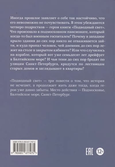 Sometimes the past asserts itself so persistently that it's impossible not to feel it. Four teenagers, the heroes of the book "Underwater Light," discover this. What happened in a boarding house near Moscow that was once a military hospital? Why does no one dare enter the building's west wing, and where did the man whose diary still lies on the desk in a locked office disappear to? Or what happened on a ship that has been drifting in the Baltic Sea for seventy years? And whose shadows still roam the staircases of old buildings and peer into apartments in St. Petersburg?