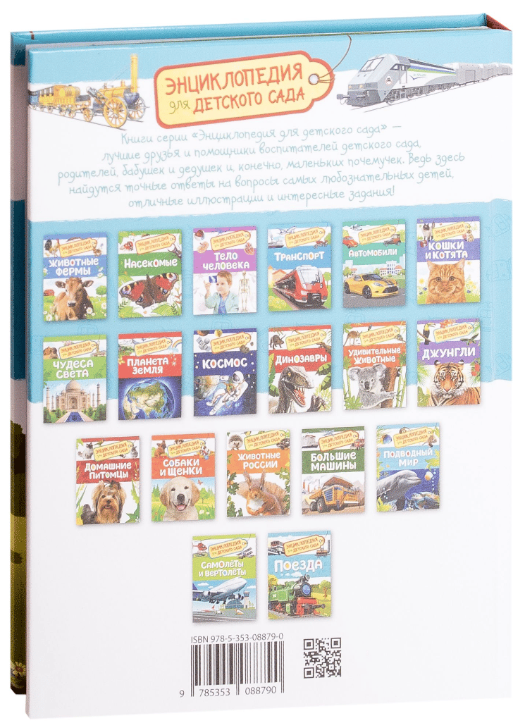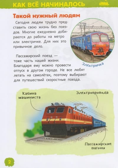 The book from the series "Encyclopedia for kindergarten" will introduce the child to old and modern trains. He will learn why trains were invented, what types there are, how a steam locomotive differs from an electric locomotive, and a funicular from a cable car.