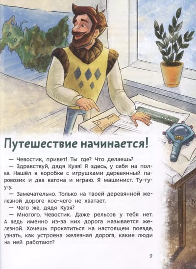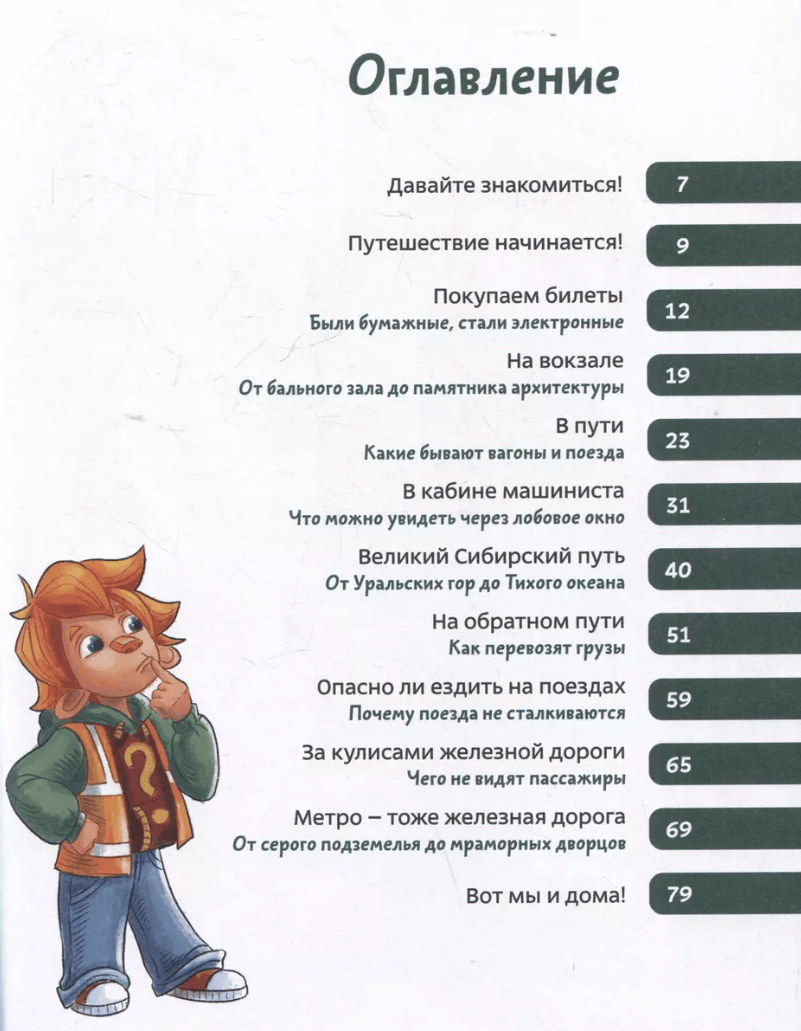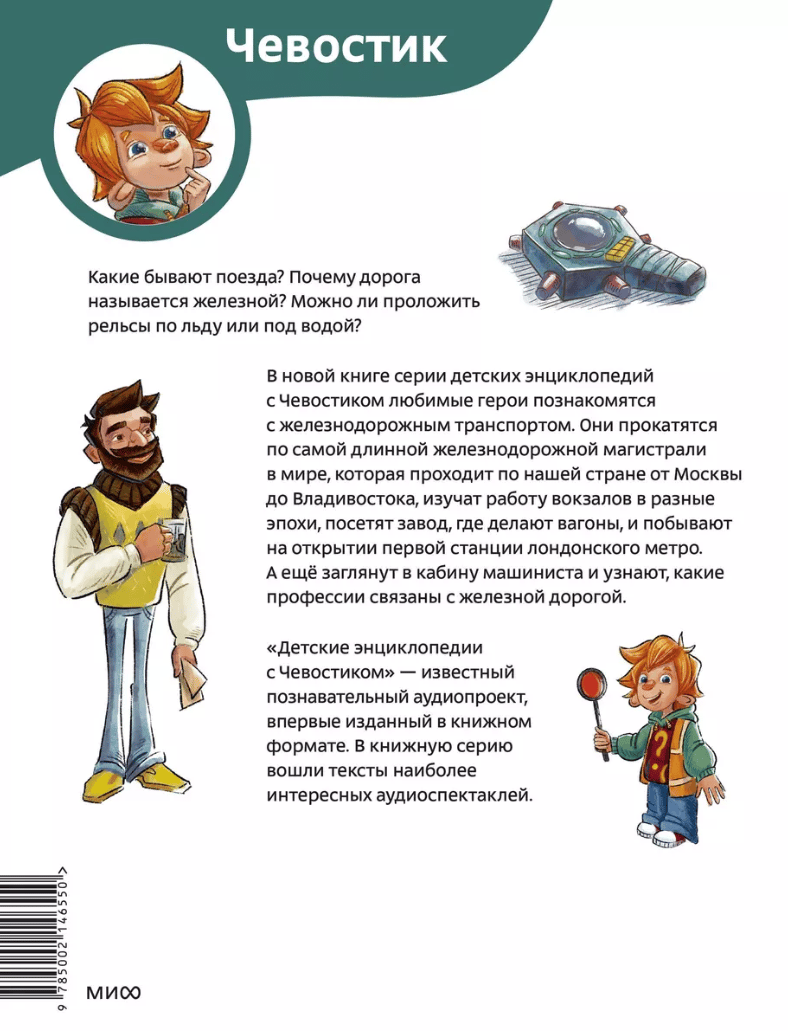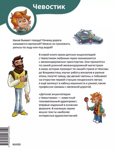 What are the different types of trains? Why is a road called a railroad? Is it possible to lay rails on ice or under water? In the new book of the series of children's encyclopedias Chevostok and Uncle Kuzya will get acquainted with the history and structure of trains, railroads and subways. They will drive along the longest railroad in the world, visit the opening of the first station of the London Underground and the factory where the cars are made, learn how stagecoach differs from the charabanc (and what it is in general), why trains do not collide and how the railroad transports cargo. And also our heroes will get acquainted with railroad professions and even look into the driver's cabin.