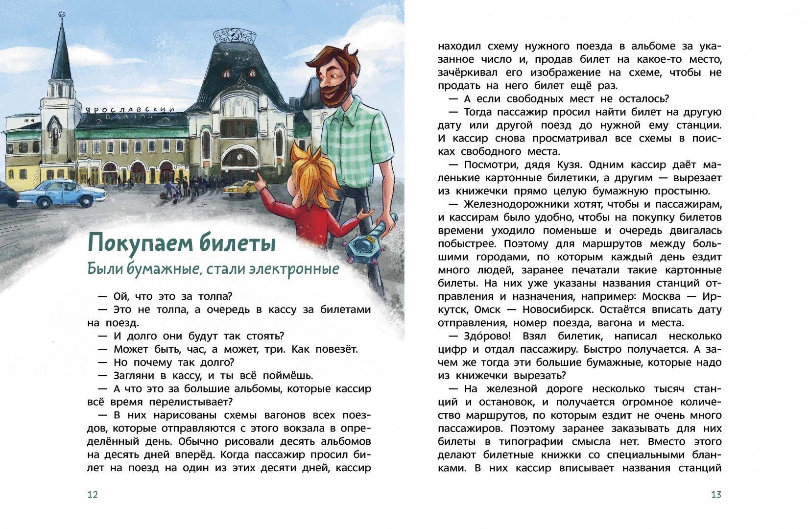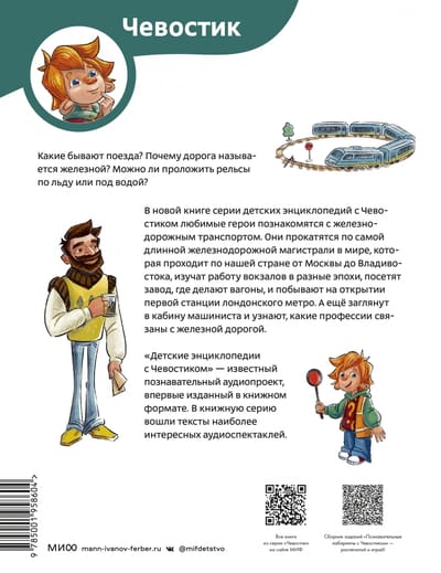 What are the different types of trains? Why is a road called a railroad? Is it possible to lay rails on ice or under water? In the new book of the series of children's encyclopedias Chevostok and Uncle Kuzya will get acquainted with the history and structure of trains, railroads and subways. They will drive along the longest railroad in the world, visit the opening of the first station of the London Underground and the factory where the cars are made, learn how stagecoach differs from the charabanc (and what it is in general!), why trains do not collide and how the railroad transports cargo. And also our heroes will get acquainted with railroad professions and even look into the driver's cabin.